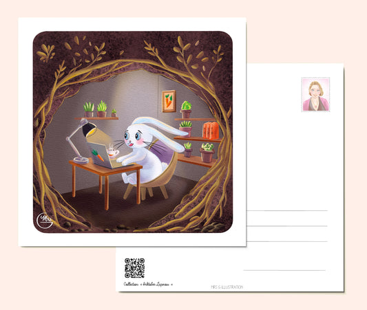 Lapinou en plein télétravail : confort, thé et productivité au terrier !