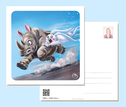 Lapinou, accroché sur un rhinocéros, dévale une pente à toute vitesse... Ca décoiffe...