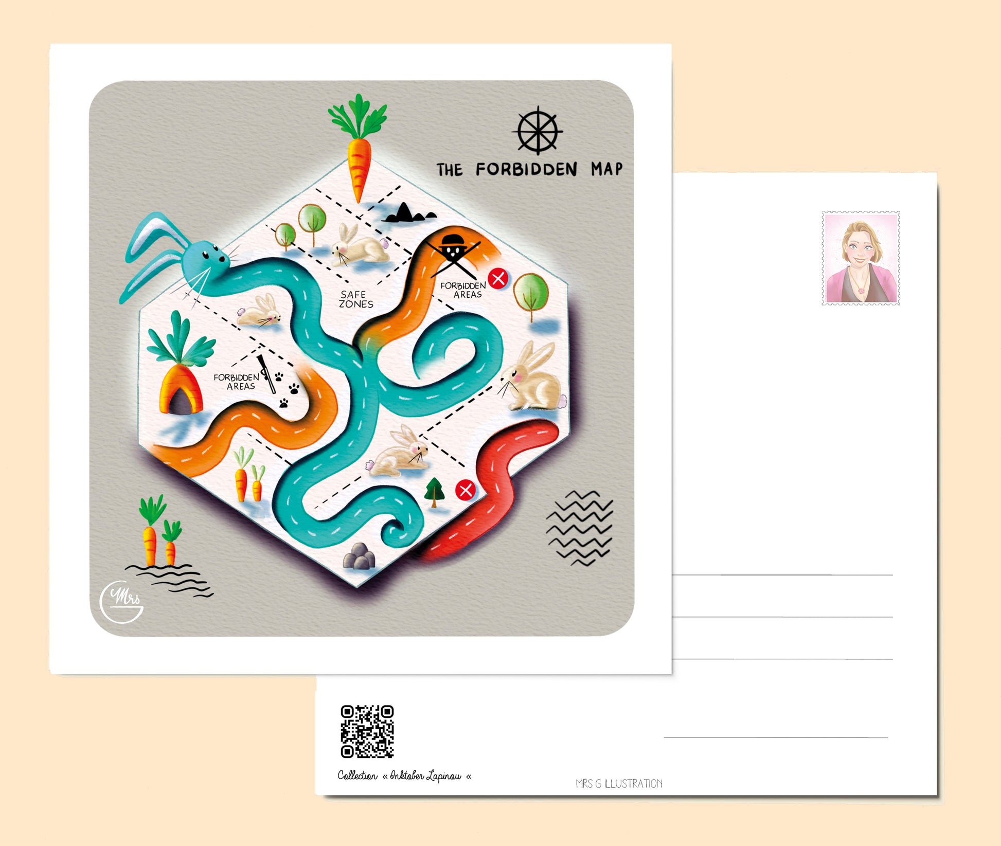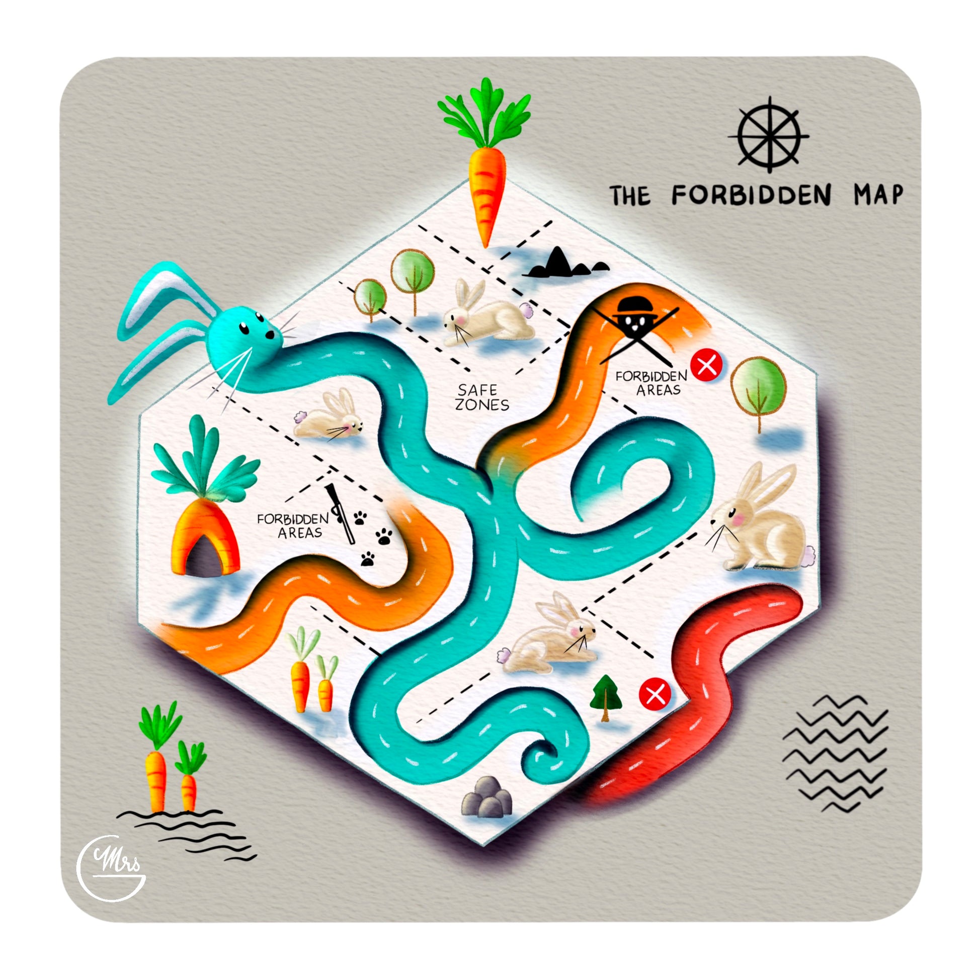 Cette illustration capture un moment intrigant avec une carte détaillée, spécialement conçue pour les aventuriers lapins. La carte montre des zones interdites aux lapins, marquées de petits symboles d’avertissement, et des chemins secrets permettant de s’échapper de ces zones interdites. Des décorations thématiques – comme des petites empreintes de pattes, des carottes dessinées, et des icônes de terriers – ajoutent une touche ludique et familière pour nos amis lapins.